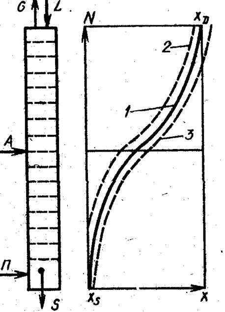 1- нормальное насыщение колонны спиртом; 2 – колонна истощена; 3- колонна перегружена; А – бражка; П - греющий пар; G – водно-спиртовые пары; L – флегма; S – остаток; N – число тарелок; ХD – крепость дистиллята; ХS – содержание спирта в остатке