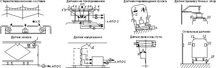 змерения нажатия токоприемника на контактный провод. Эти измерения осуществляются в диапазоне 0 - 400 Н с погрешностью не более ± 5 %. Средства измерений - оптоволоконные датчики нажатия (см. рис. 3), использующие тензочувствительные оптические элементы, меняющие коэффициент излучения оптических сигналов. Показания двух датчиков, размещенных по концам полоза токоприемника, суммируются в ИВК. Измерения вертикальных ускорений токоприемника. С этой целью применены три акселерометра для учета массы полоза при обработке результатов измерений нажатия и резких воздействий на токоприемник в вертикальном направлении, а также датчик продольных ускорений для регистрации ударов и подбоев. Допусковый двухпороговый контроль подхватов отходящих ветвей контактного провода и фиксаторов. Для этого используют две пары датчиков, расположенных по бокам полоза токоприемника, с разновысокими (разница в высоте 25 мм) гибкими касателями. Измерения напряжения в контактном проводе (3 кВ постоянного и 25 кВ переменного тока), автоматическая фиксация отрывов токоприемника. Фиксация отрывов осуществляется с погрешностью не более ± 1 % при исчезновении напряжения. Измерения перемещений кузова вагона относительно УГР. Эти измерения проводят в пределах от 0 до 150 мм с погрешностью не более ± 2 % датчиками с оптоэлектронным кодированием линейных перемещений. Измерения возвышения головки наружного рельса выполняются в пределах от 0 до 200 мм. Для получения результата используются совокупные измерения перемещений кузова вагона и истинного горизонта гироскопическим устройством "Гировертикаль". Измерения ускорений кузова вагона. Ускорения измеряют в вертикальном, продольном и поперечном направлениях в пределах от - 20 до + 20 м/с2. Измерения просадок пути. В пределах от 0 до 100 мм с погрешностью не более ± 5 % выполняют совокупные измерения боковых перемещений кузова датчиками, размещенными у противоположных тамбуров вагона, и истинного горизонта устройством "Гировертикаль". Измерения радиуса кривизны пути выполняют в пределах от 800 до 3000 м с погрешностью не более ± 10 % измеряемой величины, используя в качестве датчика вращающийся трансформатор, измеряющий угол поворота тележки вагона относительно его кузова. Измерения температуры окружающей среды. Применяют датчик на основе термопары. Автоматическая привязка к месту измерений (по номерам опор и пройденному пути). Для этой цели используют: оптоэлектронные датчики промежуточных опор (по одному с каждой стороны вагона), реагирующие на фиксаторы. При идентификации поступающих от датчиков сигналов "Опора" используется также информация от датчика скорости и пути, определяющая местонахождение опоры. В темное время суток фиксаторы подсвечиваются галогенными фарами. Измерения скорости движения. Скорость измеряется в пределах от 0 до 200 км/ч при пройденном пути от 0 до 200 км с погрешностью не более ± 1 %. Для этого бесконтактный датчик с чувствительными элементами устанавливается на буксе вагона. Датчики реперных опор - инфракрасные приемопередатчики, реагирующие на отражение от реперной опоры излучаемого ими сигнала. Предусмотрена также ручная регистрация опор. Автоматическая регистрация отклонений в состоянии контактной сети, наблюдаемых визуально из смотровой кабины. Для этой цели предусмотрен пульт с квази