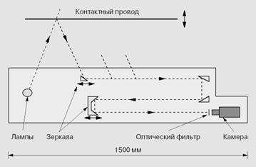 Подсветка контактного провода (КП) в темное время суток осуществляется системой галогенных фар, причем сигнал о необходимости включения (выключения) освещения подается от ИВК автоматически. Измерения высоты и отклонения в плане отходящих проводов (анкерные ветви, воздушные стрелки). Измерения выполняются той же системой СТВС и с той же точностью, что и для основного контактного провода. Бесконтактные измерения износа контактного провода. Измерения могут быть выполнены для одного-четырех проводов в подвеске с погрешностью не более ± 3 % при диапазоне поперечных сечений провода (1 x 0,5) S ном, где Sном - номинальная полная площадь поперечного сечения. В качестве датчика износа применено оригинальное устройство (патент РФ RU2000225C), представляющее собой уникальный жгут из оптических волокон диаметром 0,2 мм каждое; линейная конфигурация его входного конца образована торцами волокон, расположенными в два ряда в шахматном порядке с расстояниями между волокнами 1 мм в каждом ряду. Результирующее расстояние между волокнами составляет 0,5 мм на протяжении всей длины входной части жгута, равной 1 м. На выходном конце волукна жгута разделены и армированы оптическими соединителями. Параллельно жгуту установлен линейный осветитель контактного провода, собранный из суперлюминесцентных светодиодов инфракрасного диапазона и работающий в импульсном режиме. Оба элемента расположены на верхней раме токоприемника таким образом, что при его поднятии они оказываются на расстоянии 30 - 40 мм от нижней поверхности контактного провода и под углом 45° к нему. При работе осветителя отраженный свет попадает на те оптические волокна жгута, которые оказываются под площадкой износа контактного провода. Ширина площадки износа измеряется числом освещенных волокон, умноженным на 0,5 мм (погрешность не более ± 0,25 мм). Освещенные волокна выявляются фотодиодами, подключенными к оптическим соединителям на выходном конце жгута. Таким образом осуществляется измерение износа по ширине площадки износа контактного провода, которая в ИВК пересчитывается и представляется в виде остаточных значений высоты поперечного сечения.