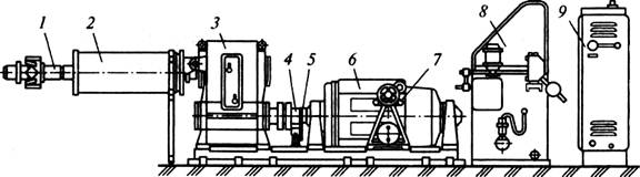 1 — карданный вал для подсоединения вала отбора мощности трактора; 2 — защитный кожух; 3 — редуктор с дистанционным управлением; 4 — упругая соединительная муфта; 5 — привод датчика электротахометра; 6 — электромашина; 7 — маятниковый динамометр; 8 — нагрузочный жидкостной реостат; 9 — силовой электрошкаф