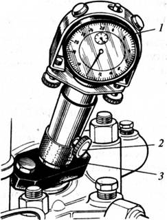 Прогревают дизель до нормального теплового состояния. Подбирают наконечник, втулку и измерительный стержень по марке дизеля и маркировке на втулке и наконечнике. Вывертывают наконечник ножки индикатора, вставляют индикатор в корпус устройства и закрепляют его скобой 1. Завинчивают в корпус устройства наконечник ножки индикатора, вводят измерительный стержень и завинчивают его в ножку индикатора. Фиксируют стержень винтом 2, устанавливают механизм подачи 3 измерительного стержня в крайнюю верхнюю позицию.