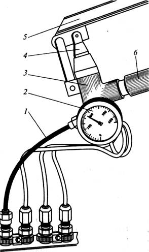 1 — топливопровод; 2 — манометр; 3 — корпус приспособления; 4 — толкатель; 5 — рычаг; 6 — рукоятка-резервуар