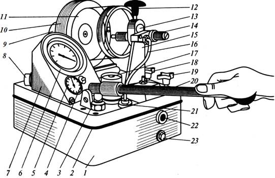1 — корпус; 2 — крышка; 3 — плунжерный насос; 4 — включатель; 5 — секундомер; 6 — манометр; 7 — кожух; 8 — вставка; 9 — электродвигатель; 10 — вентилятор; 11 — камера впрыскивания; 12 — зажимной винт; 13 — призма; 14 — проверяемая форсунка; 15 — кронштейн; 16 — топливопровод; 17 — сапун; 18, 19 — краны; 20 — рукоятка; 21 — выходной штуцер; 22 — указатель уровня топлива; 23 — сливная пробка