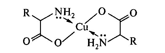 Кислотный центр СООН и основный центр аминогрупы образуют с Си(ОН)2 хелатный комлекс синего цвета.