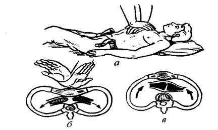 В настоящее время используют наружный (закрытый) массаж сердца, который заключается в ритмичном сжимании сердца между грудиной и позвоночником. При этом кровь изгоняется из левого желудочка в аорту и поступает, в частности, в головной мозг, а из правого желудочка – в легкие, где насыщается кислородом. После того как давление на грудину прекращается, полости сердца вновь заполняются кровью. При проведении наружного массажа сердца больного укладывают на спину на твердое основание (пол, землю). Реаниматор становится сбоку от больного и ладонями, наложенными одна на другую, надавливает на грудину с такой силой, чтобы прогнуть ее по направлению к позвоночнику на 4-5 см. Частота сжатий – 50-70 в минуту. Руки должны лежать на нижней трети грудины, то есть на 2 пальца выше мечевидного отростка (рис. 6).