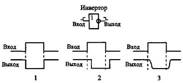 Для иллюстрации работы перечисленных моделей рассмотрим работу самого простейшего логического элемента — инвертора. Инвертор изменяет (инвертирует) логический уровень входного сигнала на противоположный уровень выходного сигнала или, как еще говорят, изменяет полярность логического сигнала. Таблица истинности инвертора (табл. 1.1) элементарно проста, так как возможны только две ситуации: нуль на входе или единица на входе. На рис. 1.4 показано, как будет выглядеть выходной сигнал инвертора при использовании трех его моде лей (трех уровней его представления). Такие графики логических сигналов называются временными диаграммами, они позволяют лучше понять работу цифровых схем.