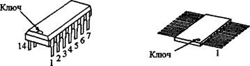 Номера выводов всех корпусов считаются, начиная с вывода, помеченного ключом, по направлению против часовой стрелки (если смотреть на микросхему сверху). Ключом может служить вырез на одной из сторон корпуса микросхемы, точка около первого вывода или утолщение первого вывода (рис. 1.20). Первый вывод может находиться в левом нижнем углу или в правом верхнем углу (в зависимости от того, как повернут корпус). Микросхемы обычно имеют стандартное число выводов из ряда: 4, 8, 14, 16, 20, 24, 28,... Для микросхем стандартных цифровых серий используются корпуса, с количеством выводов начиная с 14.