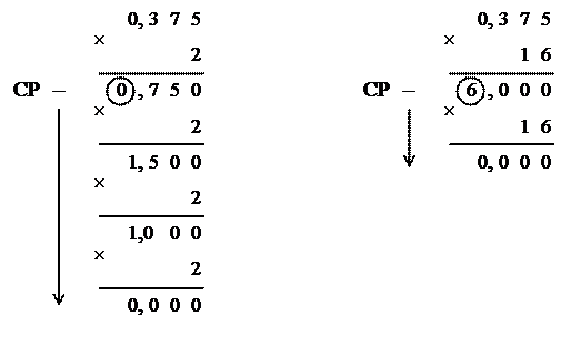 Исходную правильную дробь необходимо последовательно умножать на основание новой СС до тех пор, пока в новой дроби не будет нужного количества цифр, которое определяется требуемой точностью перевода. Результат перевода записывается из целых частей произведений, получающихся при последовательном умножении, причём первая целая часть будет старшим разрядом результата. Умножение выполняется в исходной СС.