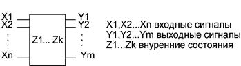 В общем случае, модель цифрового автомата (рис.2) представляет собой многополюсный черный ящик с n входами и m выходами. Состояние автомата определяется состояниями сигналов на его входах и выходах. Совокупность входных и выходных переменных Х и Y образуют входное и выходное слово автомата, соответственно.