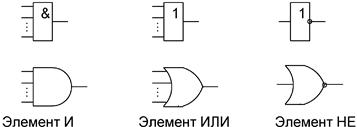 виде схемы электрической принципиальной, выполненной с использованием условных графических изображений. В частности для изображения элементов, выполняющих операции И, ИЛИ и НЕ (конъюнкцию, дизъюнкцию и отрицание), приняты следующие графические изображения: