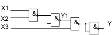 но в нашем распоряжении имеются только логические элементы И-НЕ, имеющие два входа. Поэтому для реализации необходимой функции, ее необходимо преобразовать к следующему виду: