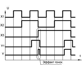 при прохождении сигнала через логический элемент иногда приводит к появлению нежелательных явлений в выходном сигнале не соответствующих реализуемой логической формуле. Это явление носит название «эффекта гонок».