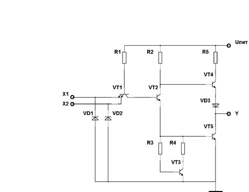 При подаче хотя бы на один из входов логического «0», транзистор VT1 переходит в состояние насыщения, при этом транзистор фазорасщепителя VT2 запирается, запирается также транзистор VT5, а ток текущий в базу транзистора VT4 через резистор R2 отпирает его и на выходе Y устанавливается высокий уровень логической «1». При наличии на обеих входах X1, X2, логической «1», ток через эмиттерные переходы VT1 не течет, при этом коллекторный переход VT1 оказывается смещенным в прямом направлении и протекающий через него и R1 ток приводит в состояние насыщения транзистор VT2. Ток, протекающий через резистор R2 и транзистор VT2, приводит к насыщению транзистора VT5. При этом напряжение на базе транзистора VT5 оказывается недостаточным для его открывания, и он запирается.