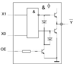 Если сигнал ОЕ (Output Enable) низкого уровня, дополнительный транзистор закрыт и включенные встречно диоды не оказывают влияния на работу выходного каскада. Если сигнал ОЕ высокого уровня, дополнительный транзистор входит в состояние насыщения, закрывая транзисторы выходного каскада и логический элемент переходит в третье состояние.