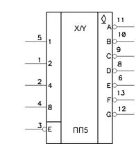 Преобразователи кодов могут быть весовыми и невесовыми. Весовые преобразуют информацию из одной системы счисления в другую. Основное назначение невесовых преобразователей – преобразование информации для ее дальнейшего отображения с помощью устройств индикации. В качестве примера рассмотрим преобразователь двоично-десятичного кода в код для отображения на семимисегментых светодиодных индикаторах К155ПП5. Его обозначение на схеме электрической принципиальной представлено на рис. 4.23.