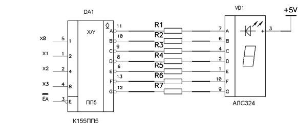 Рис. 4.24. Пример использования микросхемы семисегментного преобразователя кода К155ПП5.