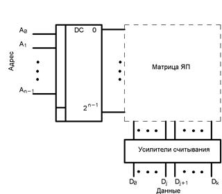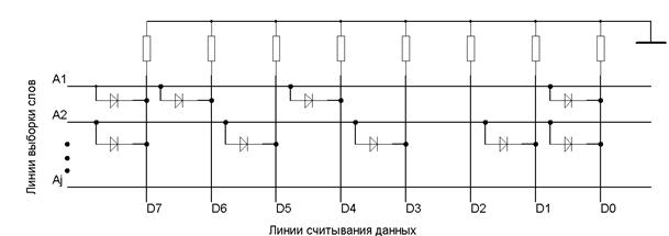 При наличии диода высокий потенциал выбранной горизонтальной линии передается на соответствующую вертикальную линию и в данном разряде появляется «1». При возбуждении (высокий потенциал) линии А1 считывается слово 11010001. При возбуждении А2 считывается слово 10101011. Линии выборки слов А1…Aj являются выходами дешифратора адреса.