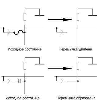 Другой тип перемычки: два встречно включенных диода. В исходном состоянии цепь можно считать разомкнутой. Для записи «1» к диодам прикладывается высокое напряжение, пробивающее диод, смещенный в обратном направлении. Диод пробивается с образованием в нем короткого замыкания.