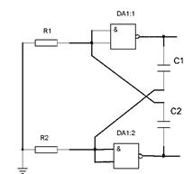 Резисторы R1, R2 и конденсаторы C1, C2 являются время задающей цепью (ВЗЦ). При работе мультивибратора в авто колебательном режиме инверторы DA1:1 и DA1:2 поочередно находятся в единичном и нулевом состояниях. Время пребывания инверторов в нулевом или в единичном состояниях определяется временем заряда одного из конденсаторов. Если DA1:1 находится в единичном (