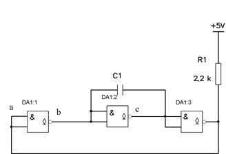 При наличии низкого уровня на входе а происходит разряд конденсатора С1 через цепь, образованную частично открытым выходным каскадом DA1:2 и входную цепь этого же элемента (выходной каскад находится в частично открытом состоянии