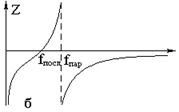 Эквивалентная схема кварцевого резонатора приведена на рис. 6.7 а, а характеристика зависимости сопротивления от частоты - на рис. 6.7 б.