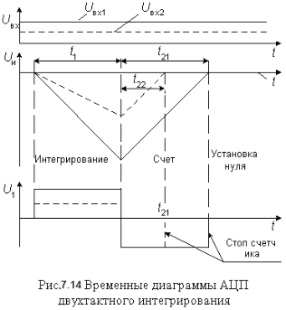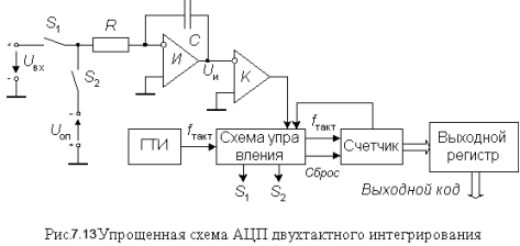 Упрощенная схема АЦП, работающего в два основных такта (АЦП двухтактного (двойного) интегрирования), приведена на рис. 7.13.