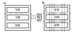 На рис. 1.1,а показано функциональное разбиение структуры процессора при создании трехкристального микропроцессора (пунктирные линии), содержащего БИС операционного (ОП), БИС управляющего (УП) и БИС интерфейсного (ИП) процессоров.