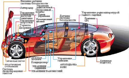 В качестве примера на рис. 1.2 приведены узлы автомобиля, в которых применяются микроконтроллеры.