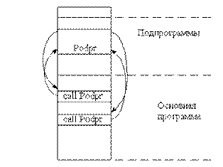 Проблема, с которой приходится сталкиваться при многократном использовании участков кодов - это в какое место памяти программ возвращаться после завершения подпрограммы. Обращение к подпрограмме производится из нескольких мест основной программы: