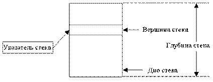 Ячейки памяти, в которых хранятся адреса возврата из подпрограмм называются стеком. Логически эти ячейки памяти организованы так, чтобы считывание последнего записанного адреса производилось первым, а первого записанного адреса производилось последним. Такая логическая организация формируется специальным счетчиком. Этот счетчик называется указателем стека SP. Ячейка памяти, в которую в данный момент может быть записан адрес возврата из подпрограммы, называется вершиной стека. Количество ячеек памяти, предназначенных для организации стека, называется глубиной стека. Последняя ячейка памяти, в которую можно производить запись называется дном стека. Логическая организация стека приведена на следующем рис. 3.3.