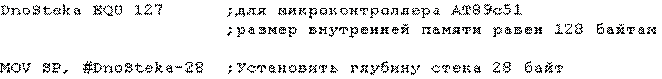 Например, в микроконтроллерах семейства MCS-51 при занесении информации в стек содержимое указателя стека увеличивается - стек растет вверх, поэтому стек размещается в самой верхней части памяти данных. Для того, чтобы установить глубину стека 28 байт, необходимо вычесть из адреса максимальной ячейки внутренней памяти микроконтроллера глубину стека и записать полученное значение в указатель стека SP: