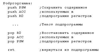 Для обращения к подпрограмме и возврата из нее в систему команд микропроцессоров вводят специальные команды. В микроконтроллерах семейства MCS-51 это командыLCALL, ACALL для вызова подпрограммы и команда RET для возврата из подпрограммы.