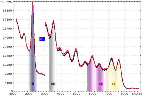 Распределение по амплитуде электрических импульсов или линий называется спектром. Например, на ядрах углерода образуются гамма-кванты с энергией 4.43 МЭВ, на ядрах кислорода – с энергией 6,13 МЭВ.