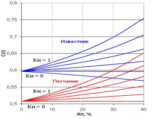 Пример зависимостей основного спектрального отношения C/O от пористости насыщенных пресной водой и нефтью кварцевого песчаника и известняка.