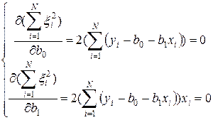 Минимум выражения (3.19) может быть достигнут за счет подборакоэффициентов b 0 и b 1. Это означает, что частные производные выражения (3.19) по неизвестным коэффициентам должны быть равны нулю.