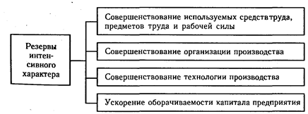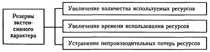 По своей экономической природе и характеру воздействия на результаты производства резервы делятся на экстенсивные и интенсивные (рис. 1). К резервам экстенсивного характера относятся те, которые связаны с использованием в производстве дополнительных ресурсов (материальных, трудовых, земельных и др.). Резервами интенсивного типа считаются те, которые связаны с наиболее полным и рациональным использованием имеющегося производственного потенциала. С ускорением НТП ослабевает роль резервов экстенсивного характера, и усиливается поиск резервов интенсификации производства.