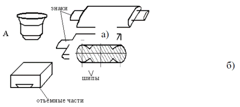 Для удержания стержня в нужном положении, во время заливки формы металлом, его вставляют в специальные углубления в форме, которые образуются выступами на модели, так называемыми знаками (рисунок 13 – б).