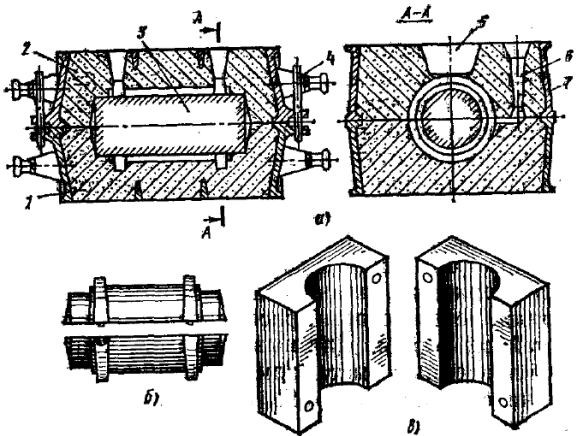 Литейная форма (рисунок 7 а) представляет собой систему элементов, образующих рабочую полость, в которую заливают расплавленный металл. Литейная форма обычно состоит из верхней 2 и нижней 1 полуформ, которые изготовляют в литейных опоках 7 — приспособлениях для удержания формовочной смеси. Верхнюю и нижнюю полуформы взаимно ориентируют при помощи металлических штырей 4, которые вставляют в отверстия приливов у опок. Для образования полостей, отверстий или иных сложных контуров в формы устанавливают литейные стержни 3, которые фиксируют при помощи выступов, входящих в соответствующие впадины в полости формы.