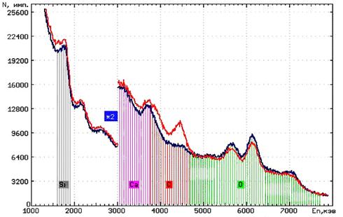 Таким образом, анализ спектров ИНГКС при наличии соответствующего интерпретационного обеспечения позволяет определять относительные содержания в породе основных элементов (O, Si, Fe, Ca, Mg, H, C), составляющих минеральный скелет (матрицу) горных пород, и четырех основных элементов (O, H, C, Cl), образующих флюид порового пространства. По полученным данным появляется возможность оценивать не только нефтенасыщенность, но и характер насыщенности при многофазном заполнении (нефть, газ, вода пластовая, вода закачиваемая) порового пространства с разделением на фазовые составляющие, а также пористость и литологический состав горных пород.
