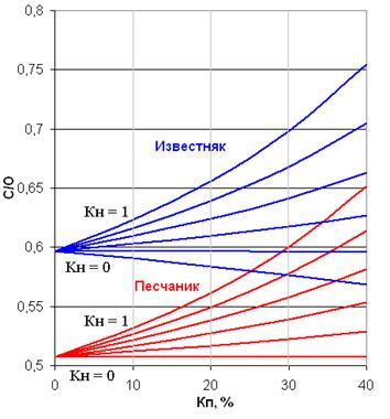 Рис. 3. Пример зависимостей основного спектрального отношения C/O от пористости насыщенных пресной водой и нефтью кварцевого песчаника и известняка. Аппаратура АИНК-89С