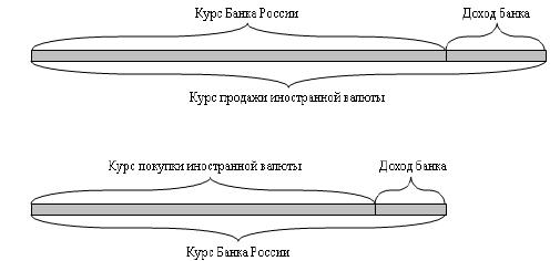 Характерно, что в структуре цены лишь два составных элемента: курс Банка России и запланированный коммерческим банком доход. И если установленный курс Центрального банка — неизменная (только в рамках одного операционного дня) для всех банков величина, то значение дохода может изменяться в зависимости от решаемых банком задач, условий ведения бизнеса, состояния ресурсов и активов кредитной организации, ликвидности баланса.