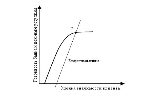 Готовность банка к ценовым уступкам клиенту определяется уровнем значимости клиента. Чем больше эта значимость, тем выше уровень готовности банка принять ценовые условия клиента. Отсюда следует, что экономическое согласие в области цен достигается тем быстрее, чем выше влияние клиента на финансово-экономические показатели банка или же его деловую репутацию. Возможности банка, между тем, не безграничны. На определённом этапе (точка «А») уступчивость банка мгновенно теряет эластичность. Способность к ценовым уступкам даёт сбой, наступает «предел насыщения»; клиент уже не представляет для банка интерес, поскольку дальнейшие уступки теряют смысл и в экономическом согласии больше нет никакого резона.