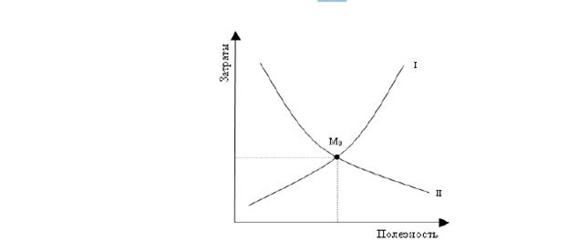 На оси ординат откладываются значения затрат, связанных с оказанием услуги. Ось абсцисс представляет шкалу полезности услуги. Кривая I кривая предложения банковской услуги; характеризуется общим положительным наклоном, при котором рост полезности услуги банка предполагает увеличение затрат на её осуществление: чем выше (оценка продавца услуги в лице финансового менеджера) полезность услуги, тем значительнее затраты банка на её оказание. И наоборот, снижение полезности услуги ведёт к уменьшению затрат на её осуществление. Являясь переменной величиной и осуществляя роль своеобразного индикатора, полезность вменяет затраты на услугу.