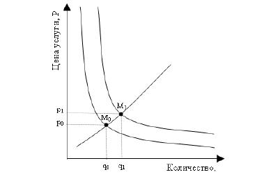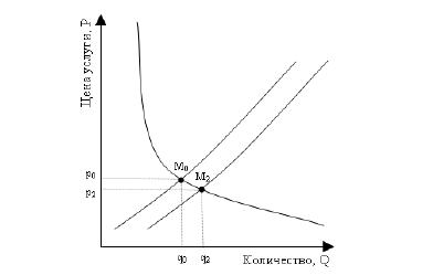 Влияние на цену оказывает и потребитель услуги банка, требующий понизить цену. При этом точка равновесия смещается к M2 (рисунок 32). Теперь уже банку необходимо принимать решение; согласие позволит ему при более низкой цене (p 0 > p2) оказать большее количество услуг (q2 > q0).