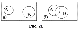 Понятие суммы событий можно проиллюстрировать на диаграммах Эйлера-Венна. Пусть событию А соответствует взятие наугад точки плоскости из области А, а событию В – взятие точки из области В, то сумме событий соответствует попадание точки в область АÈВ (рис. 21). Причем а) соответствует случаю несовместных событий, а б) – для совместных событий.