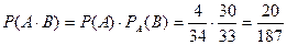 Пример 5.3.1. Ученик дважды извлекает по одному билету из 34. Какова вероятность того, что он сдаст экзамен, если им подготовлено 30 билетов и в первый раз вынут неудачный билет?