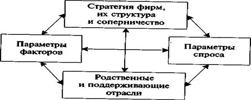 Что касается четвертого «угла» национального ромба, то здесь речь идет о стратегии и структуре национальных компаний. В данном контексте заметим, что весьма важное значение имеют модель развития национальной экономики, уклад, пропорции развития, принятые в стране управленческие структуры. Большую роль играет политика правительства данной страны.