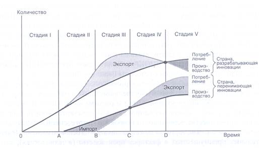 На первой стадии – внедрения нового продукта – этот продукт производится и потребляется только в стране-разработчике (отрезок времени ОА на горизонтальной оси – "фаза нового продукта"). На второй стадии (отрезок АВ – "фаза растущего продукта") продукт по-прежнему производится только в стране-разработчике, но на него уже предъявляется спрос из-за рубежа. Следовательно, продукт начинает экспортироваться. Производители страны-разработчика остаются монополистами. На третьей стадии (отрезок ВС – "фаза зрелости продукта") технология производства стандартизируется и становится доступной производителям других стран. Эти страны начинают собственное производство, в результате чего сокращается импорт. На четвертой стадии (отрезок СD) страны, перенявшие нововведение, начинают обгонять страну-разработчика по объемам продаж на мировом ранке. Производство в стране-разработчике постепенно сокращается. На пятой стадии (правее точки D) страны, перенявшие нововведение, уже завоевывает рынок страны-разработчика. Четвертая и пятая стадии получили название "фазы снижающегося продукта". Жизненый цикл некогда нового товара в стране-разработчике заканчивается. Производителям этой страны приходится вновь придумывать что-то новое, чтобы "остаться на плаву".