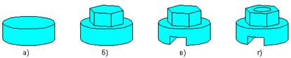 Общепринятым порядком моделирования твердого тела является последовательное выполнение булевых операций (объединения, вычитания и пересечения) над объемными элементами (сферами, призмами, цилиндрами, конусами, пирамидами и т.д.). Пример выполнения таких операций показан на рисунке.