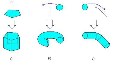 Для задания формы объемных элементов выполняется такое перемещение плоской фигуры в пространстве, след от которого определяет форму элемента (например, поворот дуги окружности вокруг оси образует сферу или тор, смещение многоугольника – призму, и т.д.).